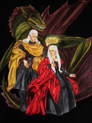 Деймон Таргариен ,известный как Порочный принц или принц Блошиного Конца, венчает короной, умершего короля Визериса, свою племянницу и жену Отраду Королевства - принцессу Рейниру Таргариен (под защитой драконицы Сиракс).