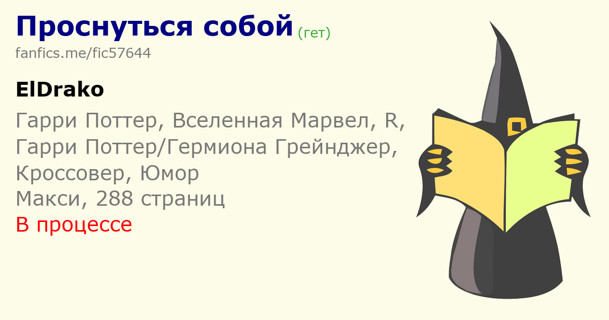 | Внезапно понял, что давно прочитанный замороженный фанфик с довольно удачным кроссом ГП и Людей X, оказывается, имеет выложенное продолжение 8) но почему-то на фикбуке. Здесь больше ГП, чем мира Марвел. Произведение серьёзное, возможно, стоило бы классифицировать как ангст? Но написано весьма неплохо, и излишних издевательств над героями нет. К сожалению, на данный момент серия не закончена и я сомневаюсь, что будет закончена. Но прочитать то, что есть, однозначно стоит. | |